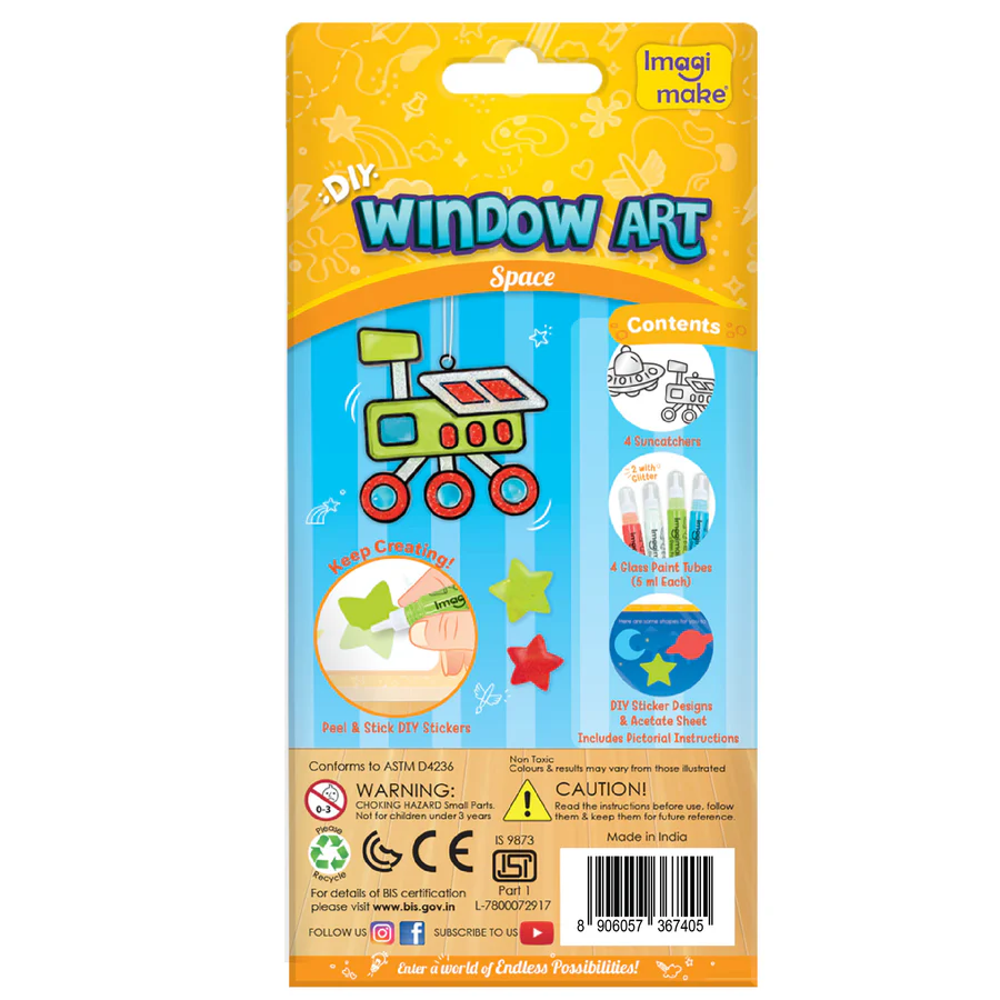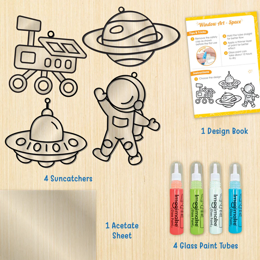 • DIY SPACE GLASS PAINTING KIT: Window Art is an arts & crafts activity set that allows young artists to try a new painting technique – glass painting in a fun & easy way.