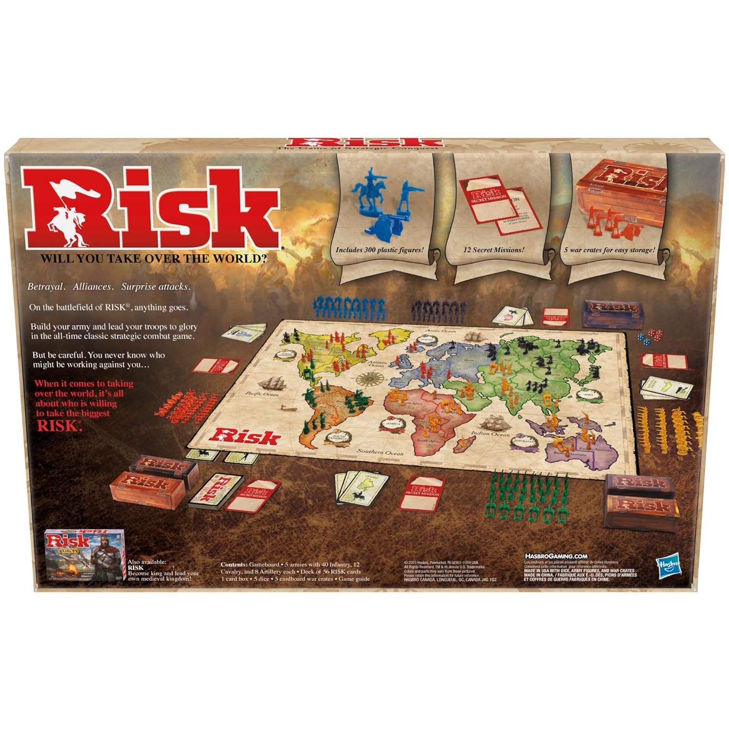 - Rich board art draws players into the Risk gaming world.; Note: dices are included inside war crate; Recommended Age: 10 Years; Color: Multi Color