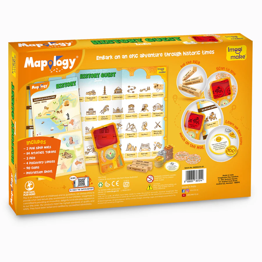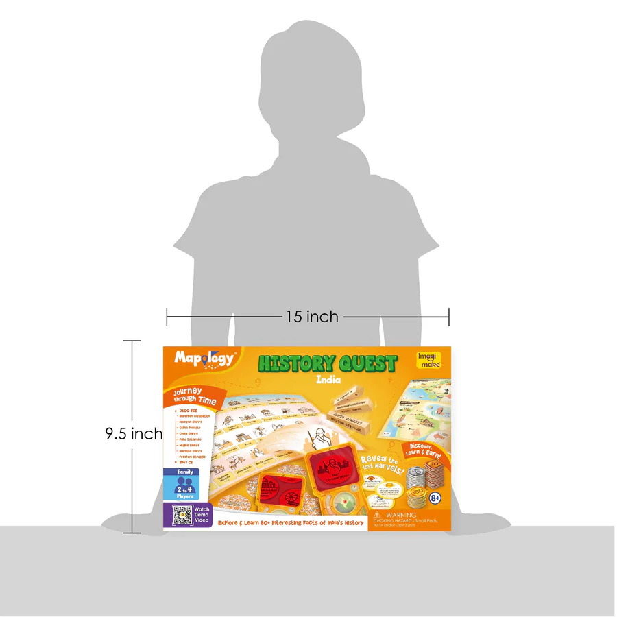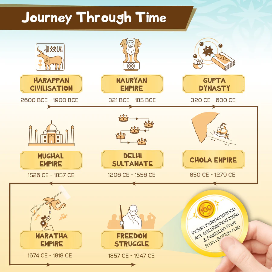 - WELCOME TO HISTORY QUEST – This educational board game covers 8 significant eras of Indian history from the Harappan Valley Civilization to the Freedom Struggle, with 80+ interesting facts about each era presented in a fun and engaging manner.
