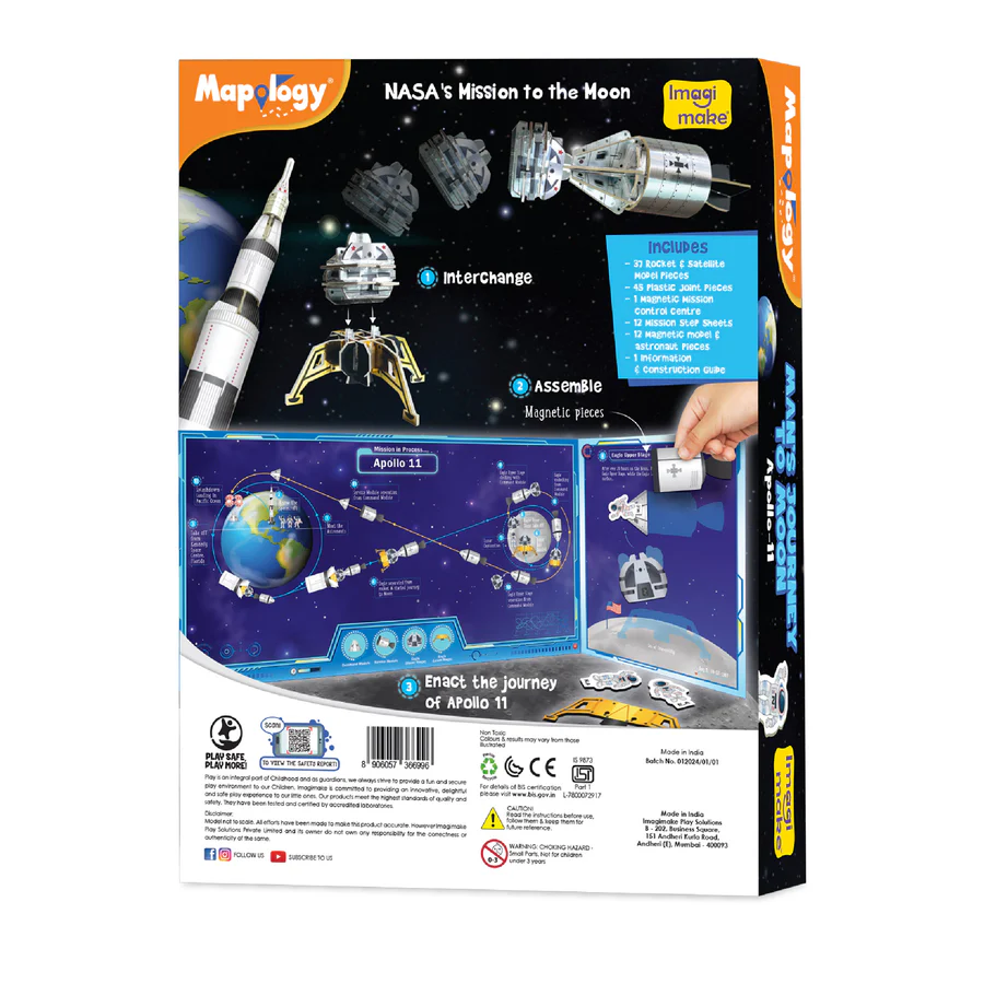 - NASA’s MISSION TO THE MOON: Imagimake inspired by NASA are excited to teach children about Man’s Journey to the Moon. This Model-making kit features 5 models: an 18-inch Saturn V Rocket and 4 satellites