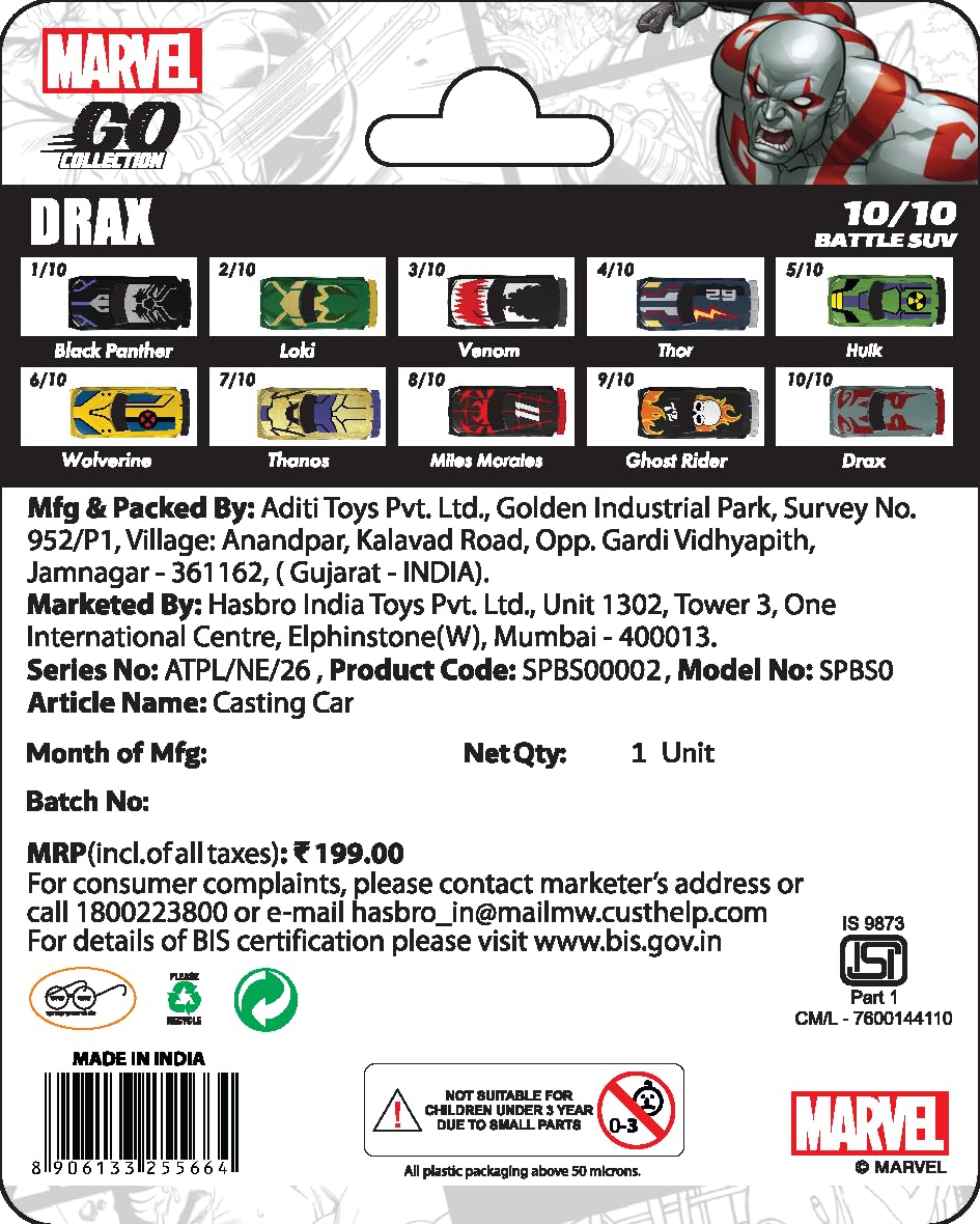 Marvel Drax Diecast Battle SUV Toy Car 1:64 Diecast Toy Car Go Collection Ages 3+